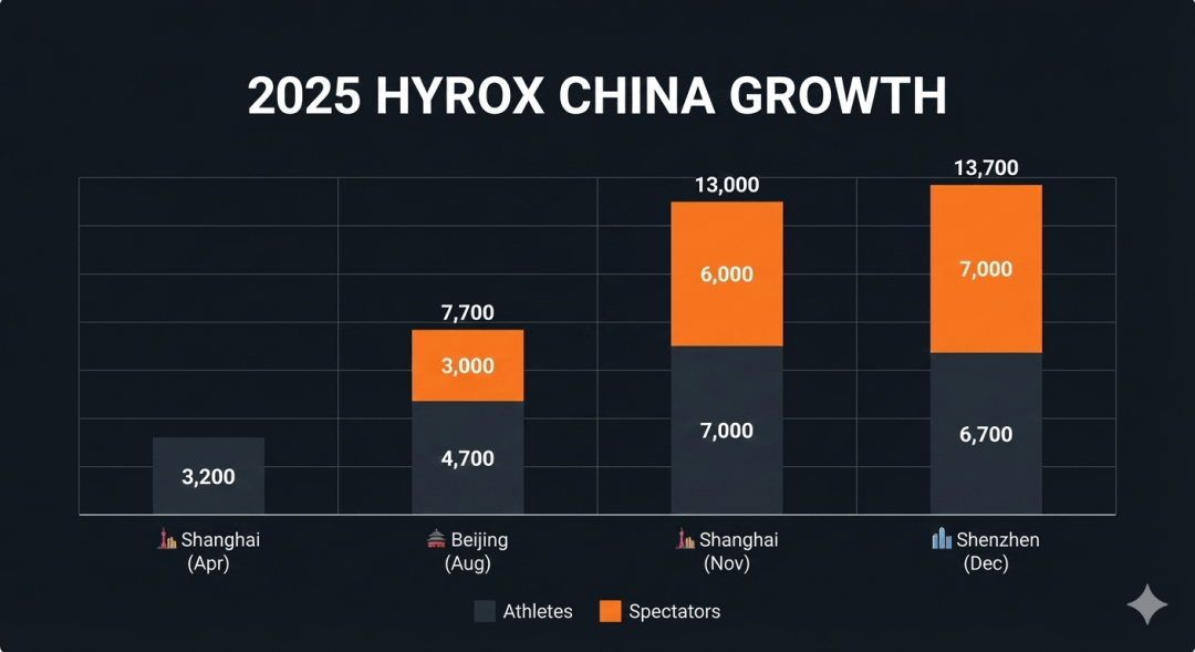 2025年4月5日,上海首站于上海世博展览馆开启,吸引了来自52个国家和地区的3200名选手,完成了2025年赛事的成功开端。随后,8月23-24日的北京站迁至国家会议中心二期,参赛人数上升至约4700名,现场观众近3000名,参与人数达到去年同期的三倍。到了11月22-23日,上海加场赛再次回归世博展览馆,近7000名参赛运动员与近6000名现场观众的规模,不仅较4月首站翻倍,更成为国内首场持续两天、超万人规模的分站赛。全年的收官之战于12月21日深圳举行,作为华南区的首场赛事,其以6700名参赛选手、7000余名现场观众的规模,刷新了HYROX中国区单场参与人数的纪录。根据公开数据,2025年HYROX中国赛事的总参与人数已突破4万人次。
