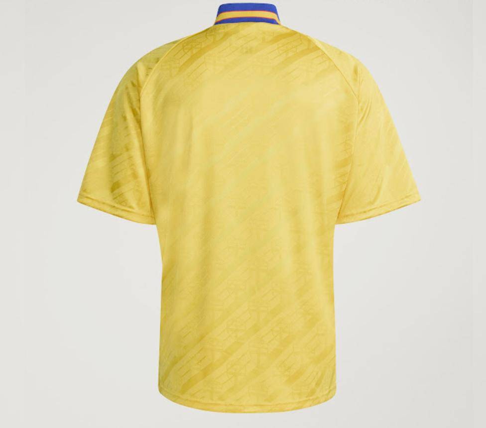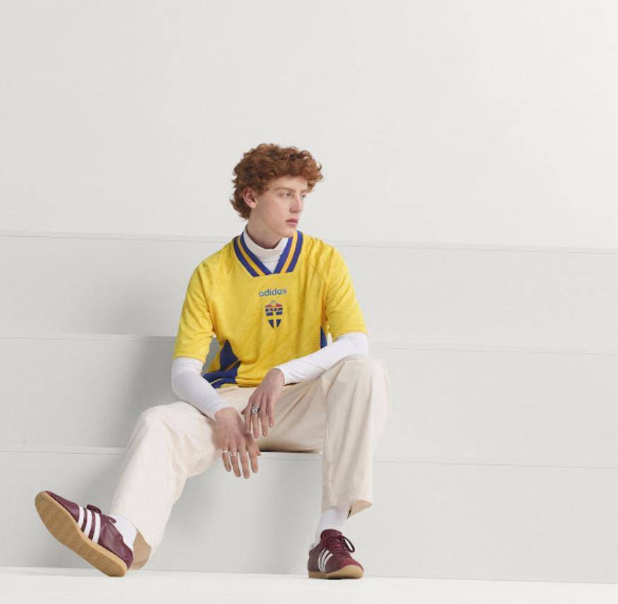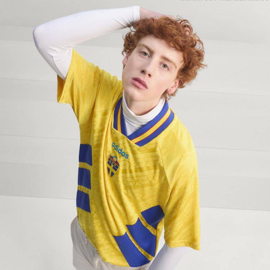 复刻版足球衫几乎与原版一模一样——采用了标志性的黄色配色、巨大的 EQT 条纹,以及瑞典足球联合会的徽章,面料上还带有斜条纹。复刻版球衣的中心位置印有阿迪达斯字样和瑞典队徽。
