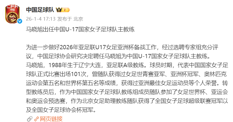 足球直播,世界杯直播,体育直播,足球比分,世界杯,足球赛事,足球,波胆,角球,串关,大小球1月4日,据“中国足球队”官方微博消息:为进一步做好2026年亚足联U17女足亚洲杯备战工作,经过选聘专家组充分评议,中国足球协会研究决定聘任马晓旭为中国U-17国家女子足球队主教练。