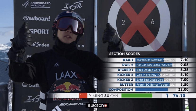 1月18日,2025-2026赛季国际雪联单板滑雪坡面障碍技巧世界杯瑞士莱克斯站男子组决赛结束争夺,中国选手苏翊鸣以76.10分摘得铜牌。